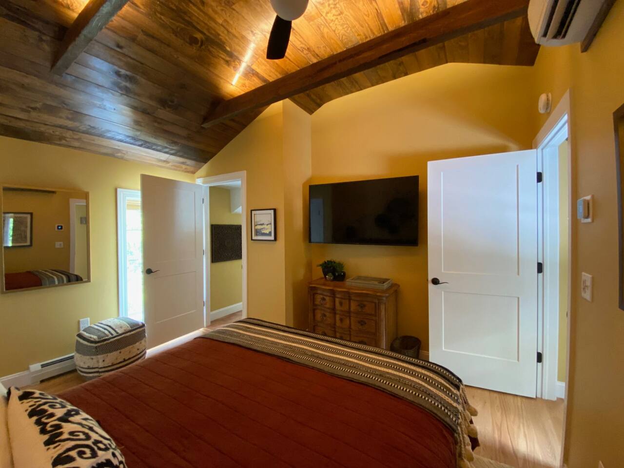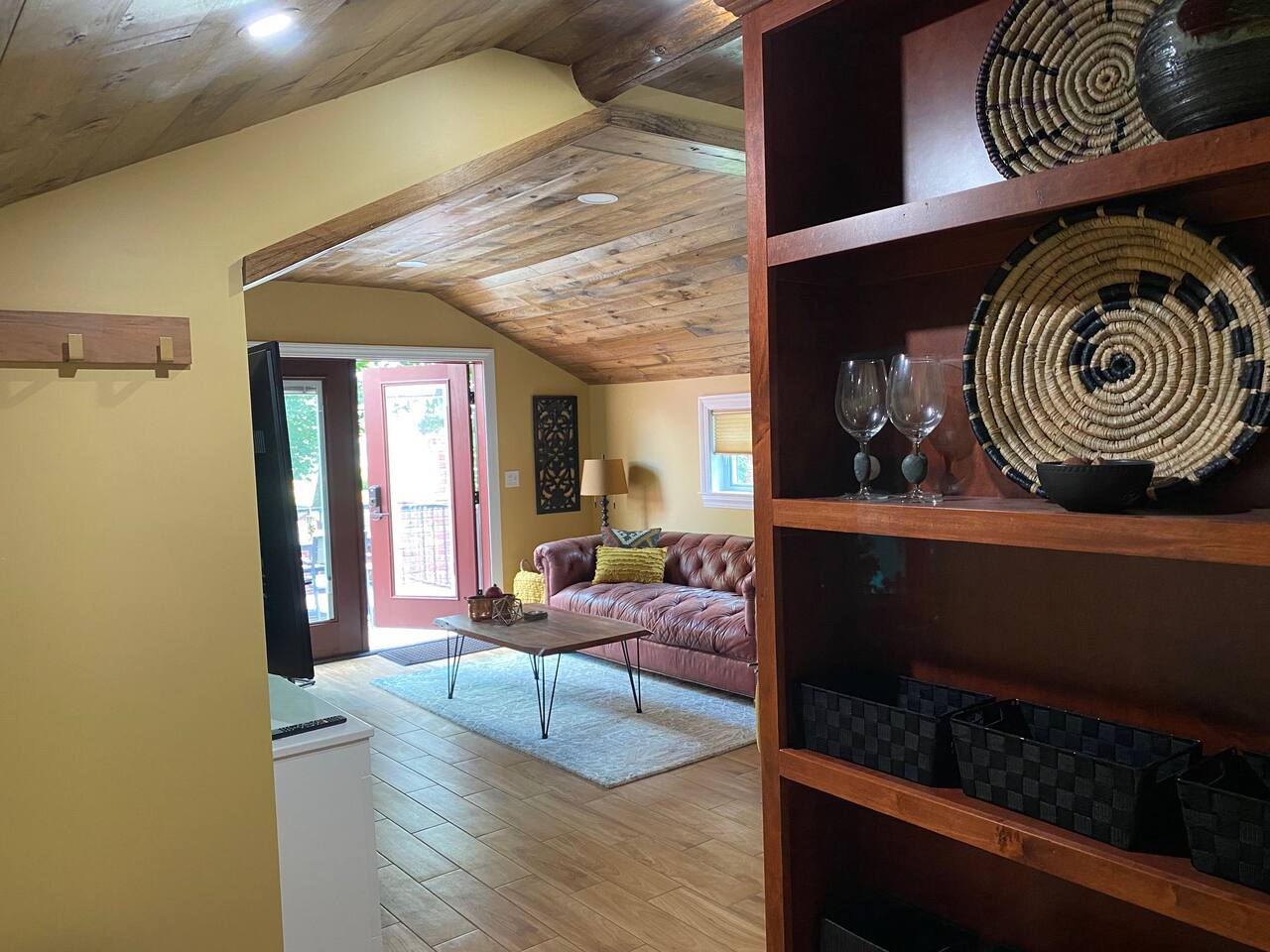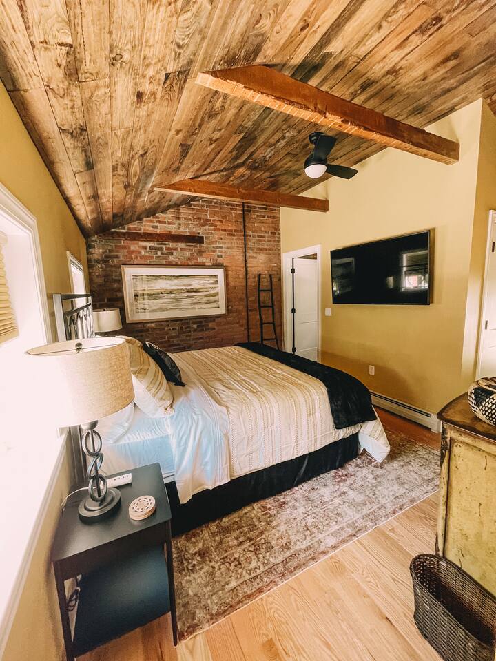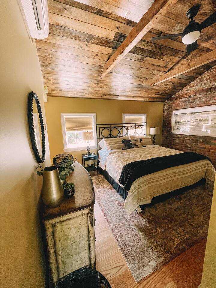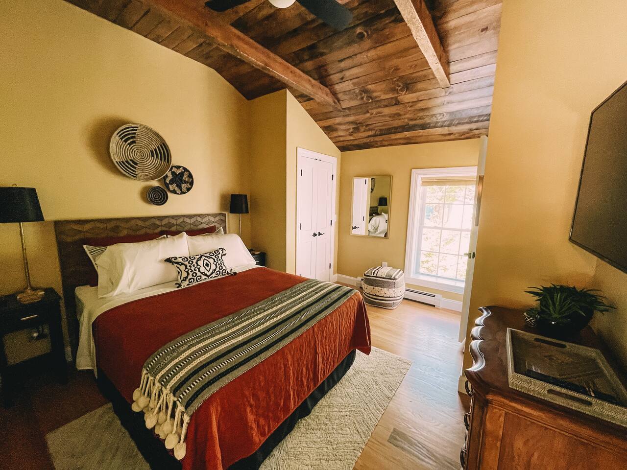 This space is designed around the theme of Fire. Enjoy bold colors, natural terra cotta and hardwood finishes, a living room with an electric fireplace and big screen TV, two bedrooms also featuring big screen TVs and finished with hardwood ceilings, the primary bedroom featuring a wall of exposed brick, bathrooms equipped with rainfall showers and one tub, a second story porch looking out over the property, a covered outdoor patio, a desk and workspace, a chef-ready kitchen including three different ways to make your coffee (drip pot, french press, and keurig machine), and a washer and dryer in the unit so you can make yourself at home during your stay. Many of the furnishings are made of sustainable materials, fair trade certified, or artisan-made. You'll find body products in the bathrooms chosen for their emphasis on human and environmental health, and eco-friendly cleaning supplies are used to keep the space spotless and safe for you and your family. All bed linens and bath linens are Oeko-Tex "Made In Green" and GOTS (Global Organic Textile Standard) certified. The porch and patio offers a private outdoor space exclusively for guests staying in Fire, and there is also a grill for your use. The unit features high speed wireless internet, smart TVs to stream shows and movies from any major streaming service of your choice, and a collection of board games and books to enjoy during your stay. Beds: 1 King 1 Queen