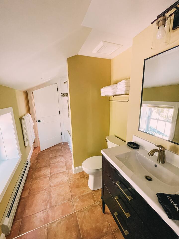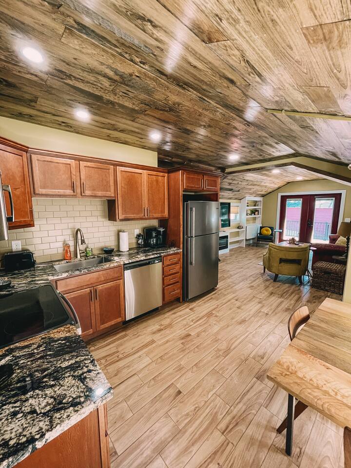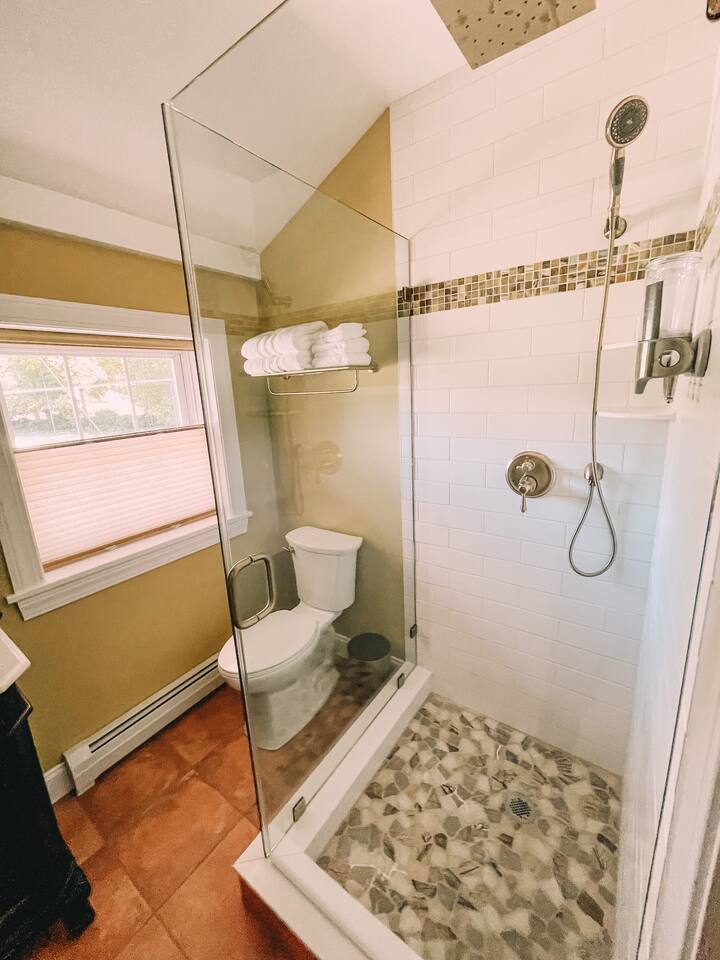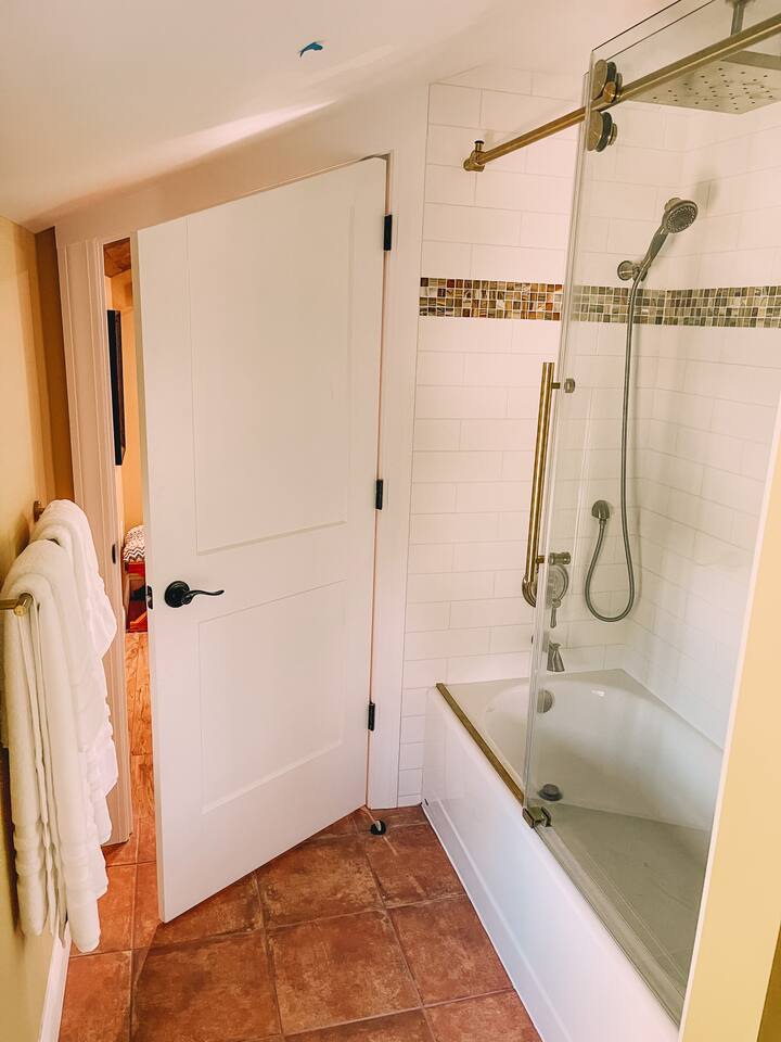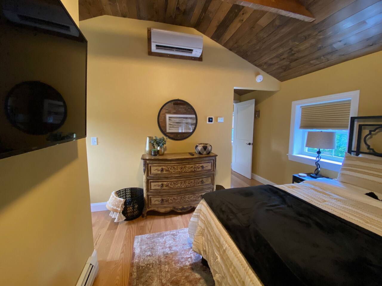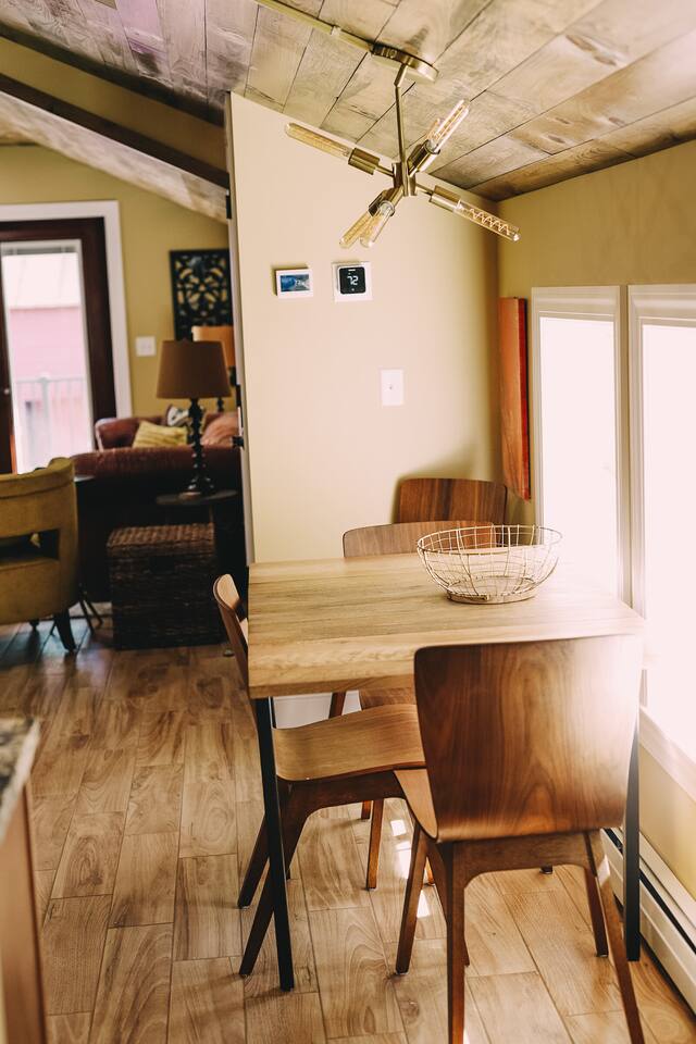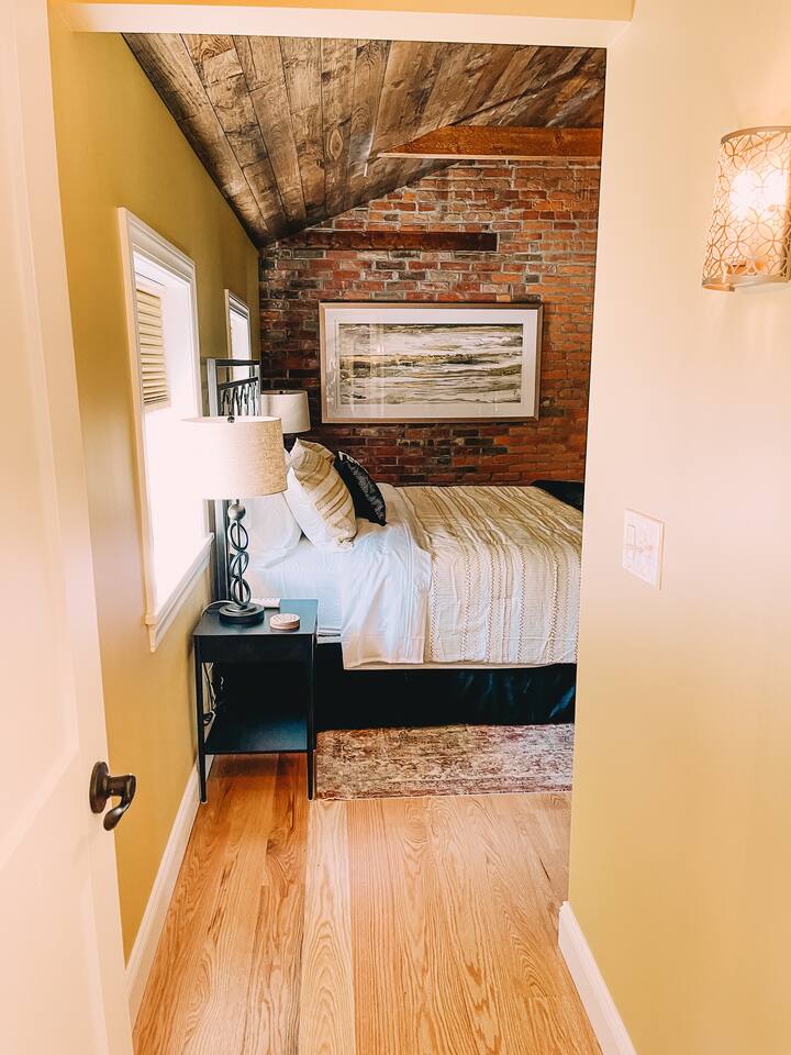 This space is designed around the theme of Fire. Enjoy bold colors, natural terra cotta and hardwood finishes, a living room with an electric fireplace and big screen TV, two bedrooms also featuring big screen TVs and finished with hardwood ceilings, the primary bedroom featuring a wall of exposed brick, bathrooms equipped with rainfall showers and one tub, a second story porch looking out over the property, a covered outdoor patio, a desk and workspace, a chef-ready kitchen including three different ways to make your coffee (drip pot, french press, and keurig machine), and a washer and dryer in the unit so you can make yourself at home during your stay. Many of the furnishings are made of sustainable materials, fair trade certified, or artisan-made. You'll find body products in the bathrooms chosen for their emphasis on human and environmental health, and eco-friendly cleaning supplies are used to keep the space spotless and safe for you and your family. All bed linens and bath linens are Oeko-Tex "Made In Green" and GOTS (Global Organic Textile Standard) certified. The porch and patio offers a private outdoor space exclusively for guests staying in Fire, and there is also a grill for your use. The unit features high speed wireless internet, smart TVs to stream shows and movies from any major streaming service of your choice, and a collection of board games and books to enjoy during your stay. Beds: 1 King 1 Queen